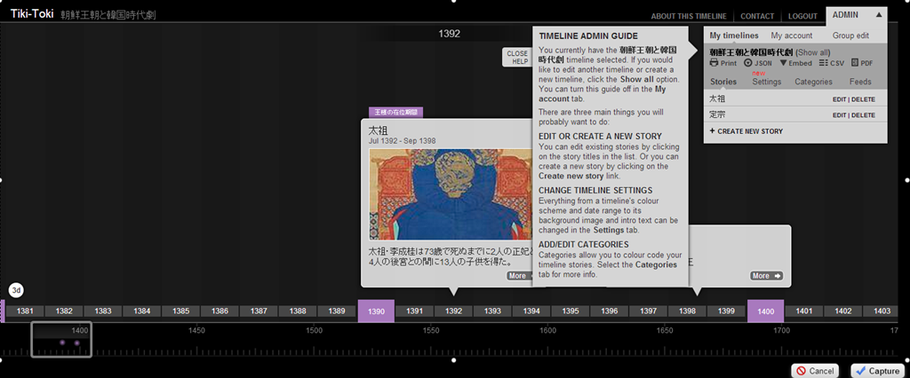 多分、デザイン的にもエレガントで機能もばっちり入っている年表サービスです。ある一時期を示すイベント、期間を示すタイムスパンを表現することができます。また、良くある日本史と世界史を並列に見せて対比するということもカテゴリー機能を使うとできそうです。(これは試していないのであくまでも推測)