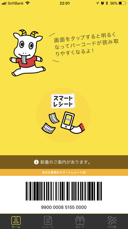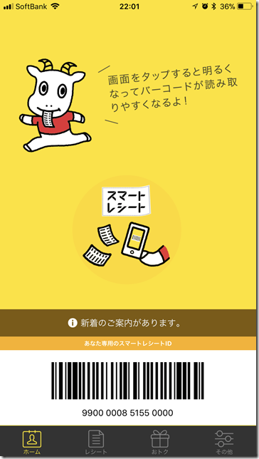 スマートレシートは会計の時に↑の写真にあるバーコードを読み取ってもらいます。読み取ってもらうと自動的にレシートの情報が取り込まれます。↓